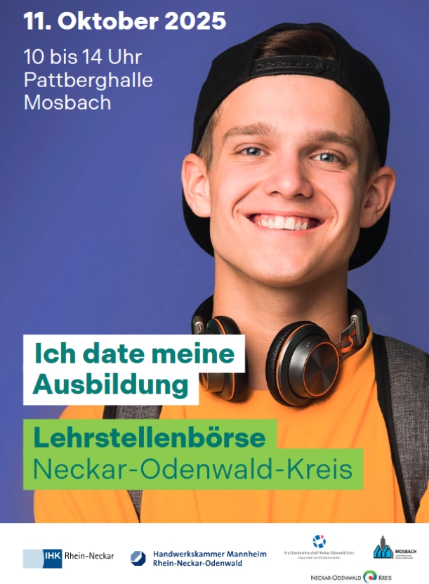 Einen Samstag voller Chancen bietet die Lehrstellenbörse Neckar-Odenwald-Kreis am Samstag, 11. Oktober 2025 von 10:00 bis 14:00 Uhr in der Pattberghalle Mosbach-Neckarelz.